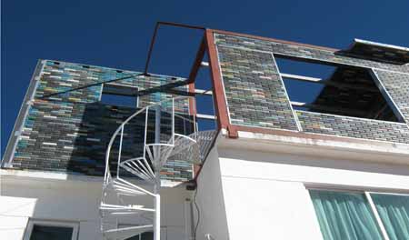 El techo puede ser estructurado con estos módulos y también con pequeñas bases de madera o columnas de cemento; la empresa ofrece también muebles diseñados con PET.
