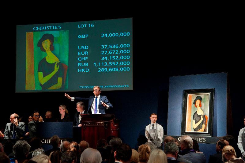 The Impressionist and Modern Art Evening Sale and the auction of The Art of the Surreal took place on the evening of 6 February at Christie’s London, realising $213,4M and selling 89 percent by lot and percent by value. The auctions had a combined pre-sale estimate of £89.8M to £132.8M. The top price was paid for Jeanne Hébuterne (au chapeau), 1919, by Amedeo Modigliani (1884-1920) which sold for $42,104,835.
