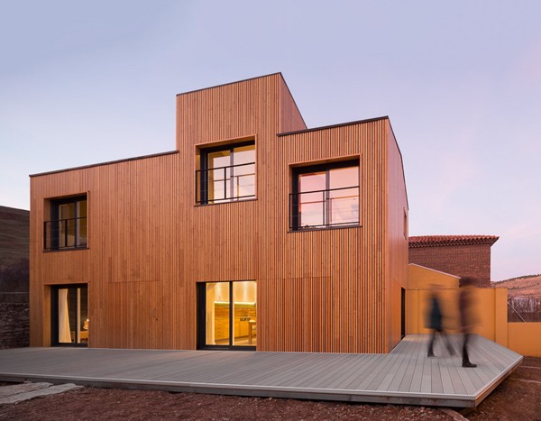 Carmina Casajuana , Beatriz García y Marcos González recurren a la utilización del sistema modular prefabricado con el objetivo de satisfacer el deseo del cliente: una vivienda que se aleja considerablemente del modelo tradicional de construcción local. De esta forma logra destacar en la trama compacta del pueblo mientras se integra sin estridencias.
