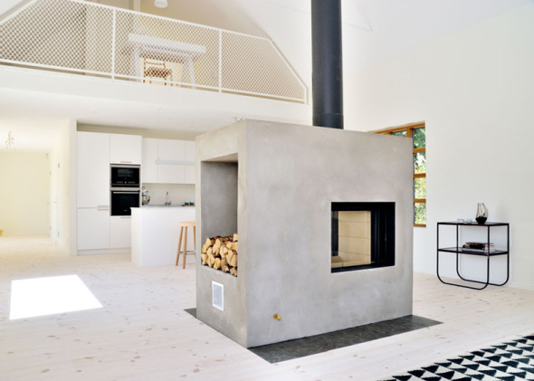 Esta casa situada en un antiguo pueblo de pescadores en Suecia tiene pálidas losas de pino, techos altos y una estufa de leña en el interior de un bloque de concreto.