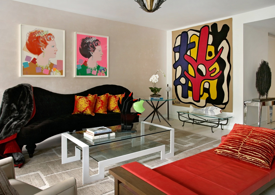 Apartment #3CE at 1 Morton Square features the work of luxury designer Miles Redd for Jonathan Lupo. Lupo purchased the first apartment in 2004, then the second in 2010; this vibrant setup is the product of two combined apartments that were renovated into one large space.