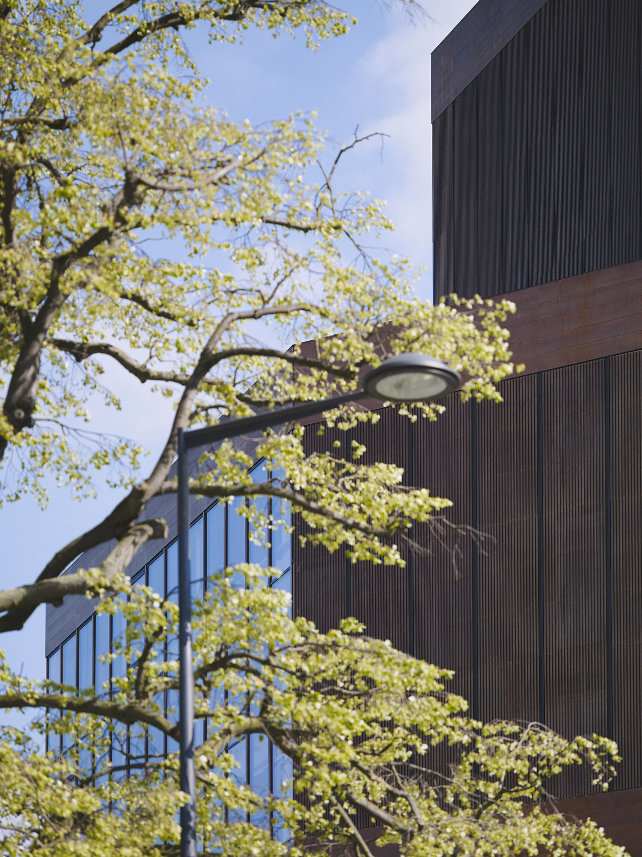 Hence, at the centre of a visual connection, the tower rises up from the ground-floor base plinth and responds to the three principal axes that intersect it (Avenue Le Corbusier, Boulevard Pasteur and rue Faubourg de Roubaix) in the sense that each side of the prism is parallel to one of the axes. In this way LAN have let the building be influenced by its urban context in terms of its form and volume. As if to say: the form (and the city) precedes the function. It would be too obvious to try and guess who is the inspiration for such a principle but it is certainly not Koolhaas, even though there would be something to say about it. Whatever the case, the elevations are diversified according to an alternation of solid and void where the voids are made up of glass and the solid of different types of metallic mesh, in actual fact oxidised copper. The optical result is a prism with a net sculptural value that recalls, but only in certain elements, some works by Simon Ungers who was an artist who died prematurely, stopping midway between sculpture and architecture. In reality the tower is completely glazed but we only realise this on the inside from where we can observe the city from every angle: every elevation in fact corresponds to a different area: at the north the cemetery, to the east an area of low housing, on the south the raised Valladolid piazza, south east avenue Le Corbusier and so on.