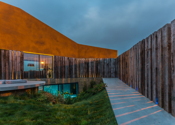“El reciclaje de materiales como los muros de antiguas traviesas de madera para vías férreas introduce un cierto experimentalismo e innovación de la forma en que el material se utiliza generalmente”—Atelier Data. Cuando se cierran los listones de madera, la propiedad parece sin ventanas a los espectadores y la entrada desaparece detrás de la fachada reciclada. La cementación de color cobre y el corcho revestido están presentes en el exterior de la propiedad, el cual se eleva desde un jardín de flores silvestres hundido ocupando el centro de la parcela.