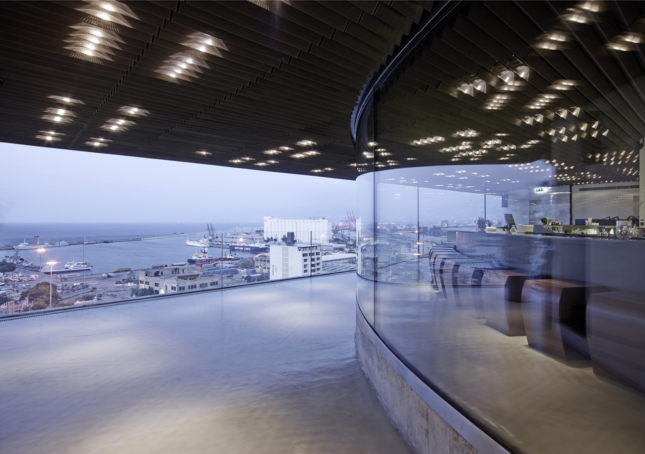 Stereokitchen uses a simple design strategy to create complex spatial possibilities and perceptual effects. The restaurant bar is a simple glass pavilion on the last floor of an office building in Beirut. It enjoys views on the city, from one side the city and the Mediterranean sea with Beirut’s Port from the other. The top of the pavilion is constituted partly by the existing concrete slab and partly by an added metal structure cantilevering to cover the whole area below. The edge of the cantilever becomes very thin (2cm) and runs along the whole length of the facade (25meters) and the corner on both sides.