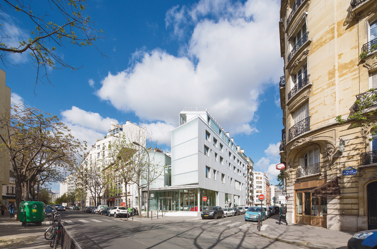 Occupying the typical Parisian street-corner lot, the building marks the neighbourhood with its luminescent front facade day and night. The building succeeds in extending several distinct levels while remaining in the same envelope, integrating two identities in a principle of uniqueness; the public program of Patronage Laïque and the private housing units.