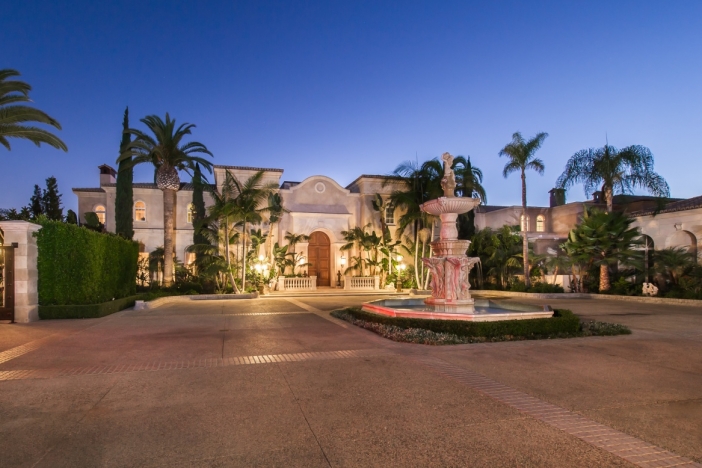 Besides the property’s triple-digit price tag, other jaw-dropping features are a private waterfall; gorgeous, twin-curving staircases; spacious-beyond-belief dining and living rooms that open onto the grounds; a chef’s kitchen with a commercial walk-in refrigerator; and views of the iconic Los Angeles canyons, city lights, and ocean. Outdoor recreational facilities include a swimming pool, spa, outdoor barbecue area, and tennis court. The six-building house can accommodate a high volume of guests, as it provides garage parking for 27 cars and has parking for up to 150 cars on-site.
