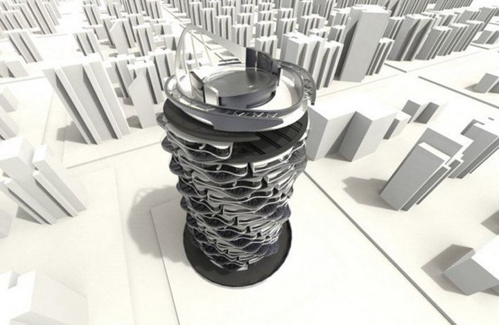 Dubbed “Turn to the Future,” the ambitious spinning skyscraper concept features a building with units that rotate at predetermined times, giving everybody a 360-degree view of the city. The structure would showcase apartments sliding on a spiral rail around a central pillar. Each home’s gas and electric lines would automatically detach before moving and reattach in new ports at its destination to avoid fire issues, and each front door would lock before repositioning. Once the apartment reaches the bottom of the spiral, it would be whipped back up to the very top of the building by a crane.